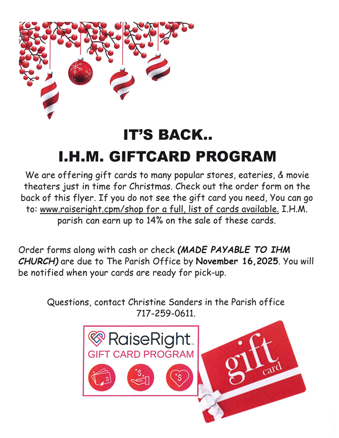 Immaculate Heart of Mary is a Roman Catholic parish family called to be disciples of Jesus Christ, fostering spiritual growth in our worshiping community; encouraging greater participation in living and sharing the Catholic faith through prayer and action; and providing for the benefit of individuals, families, and the larger community.