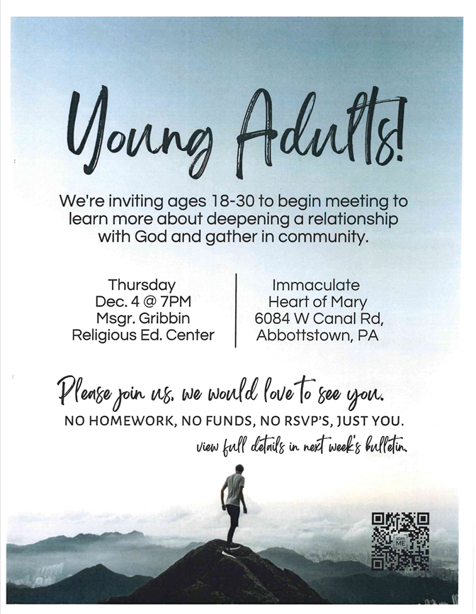 If you have children ages 4 and 5 years old up to and including 8th grade, you are invited to register them for the 2025-2026 Religious Education Program here in our parish. Classes are held on Sunday morning from 9:30 to 11:00 a.m. If you have any questions or would like to register your child/children, please call Sister Rosanne at 717-259-0611, ext. 7.