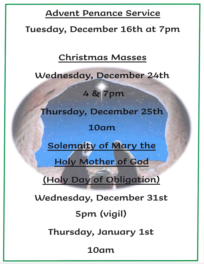 We will have a "Children's Choir" for the 4:00 p.m. Mass on Chjristmas Eve. If you have children ages 4 and above who would like to be part of the choir, please call or email Sister Rosanne.