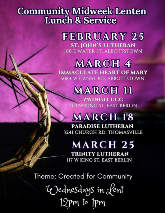 Ecumenical Lenten Luncheon/Service, Wednesday, Noon to 1 p.m., Zwingli UCC, East Berlin, Pastor Barb Brenneman
