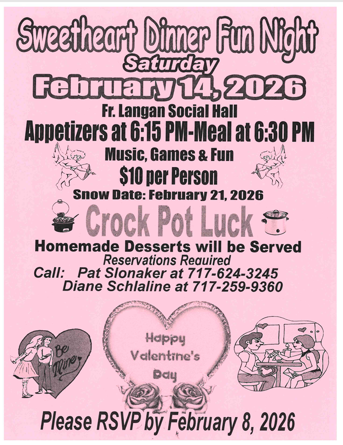 The annual Souper Bowl of Caring drive is seeking donations until February 15. Most needed items include laundry detergent, personal hygiene items, toilet tissue, facial tissues, and cleaning supplies. Food and Ruth Harvest items (single-serving sizes of Chef Boyardee bowls, mac/cheese bowels, cereal, and tuna/chicken salad punches) are also needed. Monetary donations should be made payable to Immaculate Heart of Mary and placed in the collection in an envelope marked Souper Bowl of Caring. Our parishioners have been generous in the past, and we are hoping for your support again this year. For more information, contact Pat Renaut at patrenaut@hotmail.com or 717-637-1110.